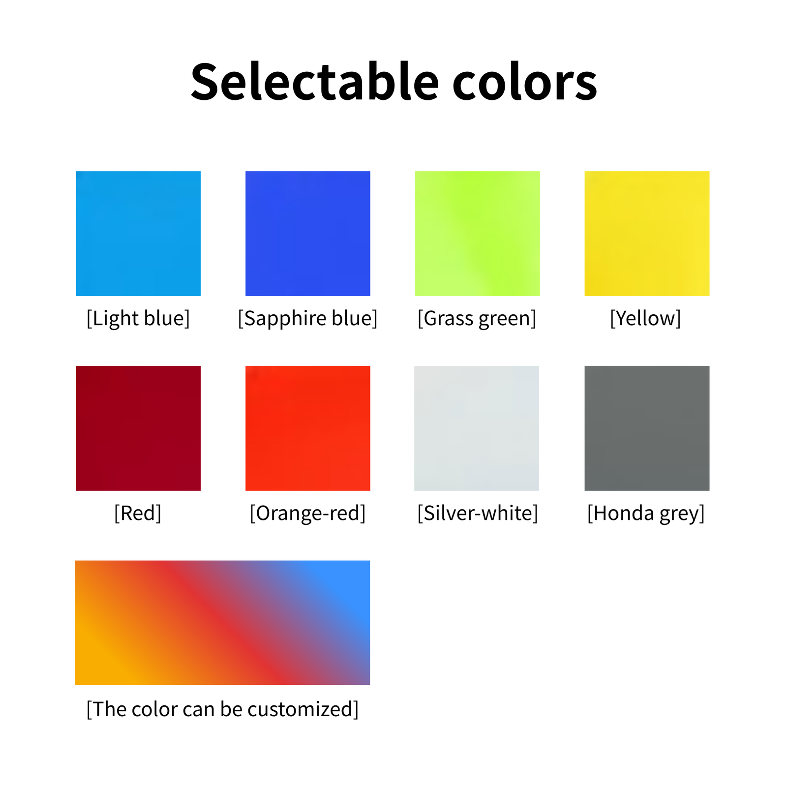 | Optional colors | Red, Orange-red, Light blue,Royal blue, Yellow, Gray, Silver white, Grass green, Custom colors (Customizable starting from 10 units) |